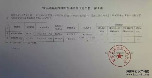 為確保養(yǎng)殖戶利益,保證如東蝦苗品質(zhì),如東縣南美白對蝦協(xié)會與江蘇省海洋研究所聯(lián)合建立的蝦苗檢測平臺也同期啟動,并對中正水產(chǎn)的兩批南美白對蝦蝦苗進行了WSSV、IHHNV、EMS、EHP等4項指標的檢測。檢測結(jié)果均為合格,四項指標正常!